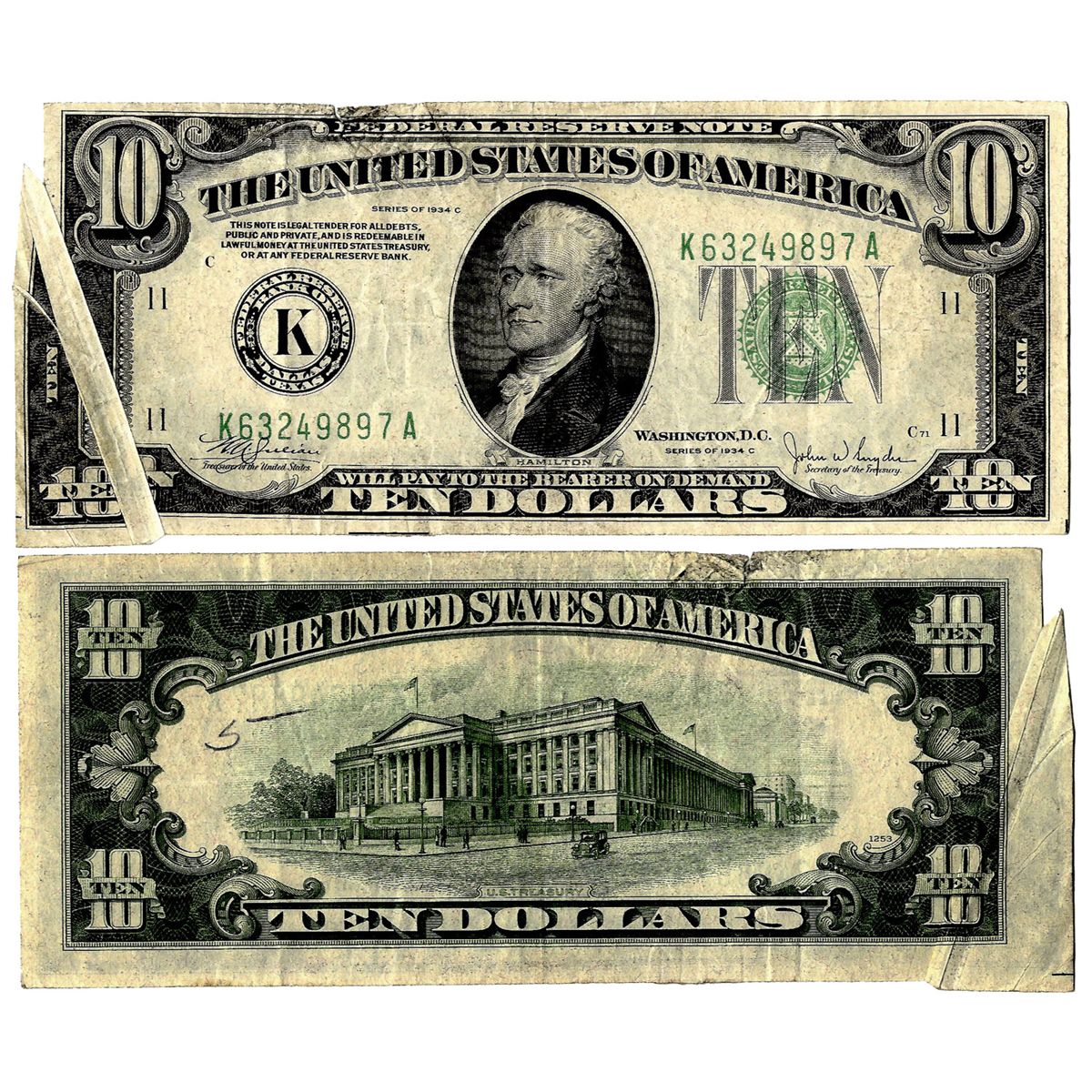 $10 Federal Reserve Error Note -- Series 1934-C, Dallas -- Gutter Fold to Lower Left Corner