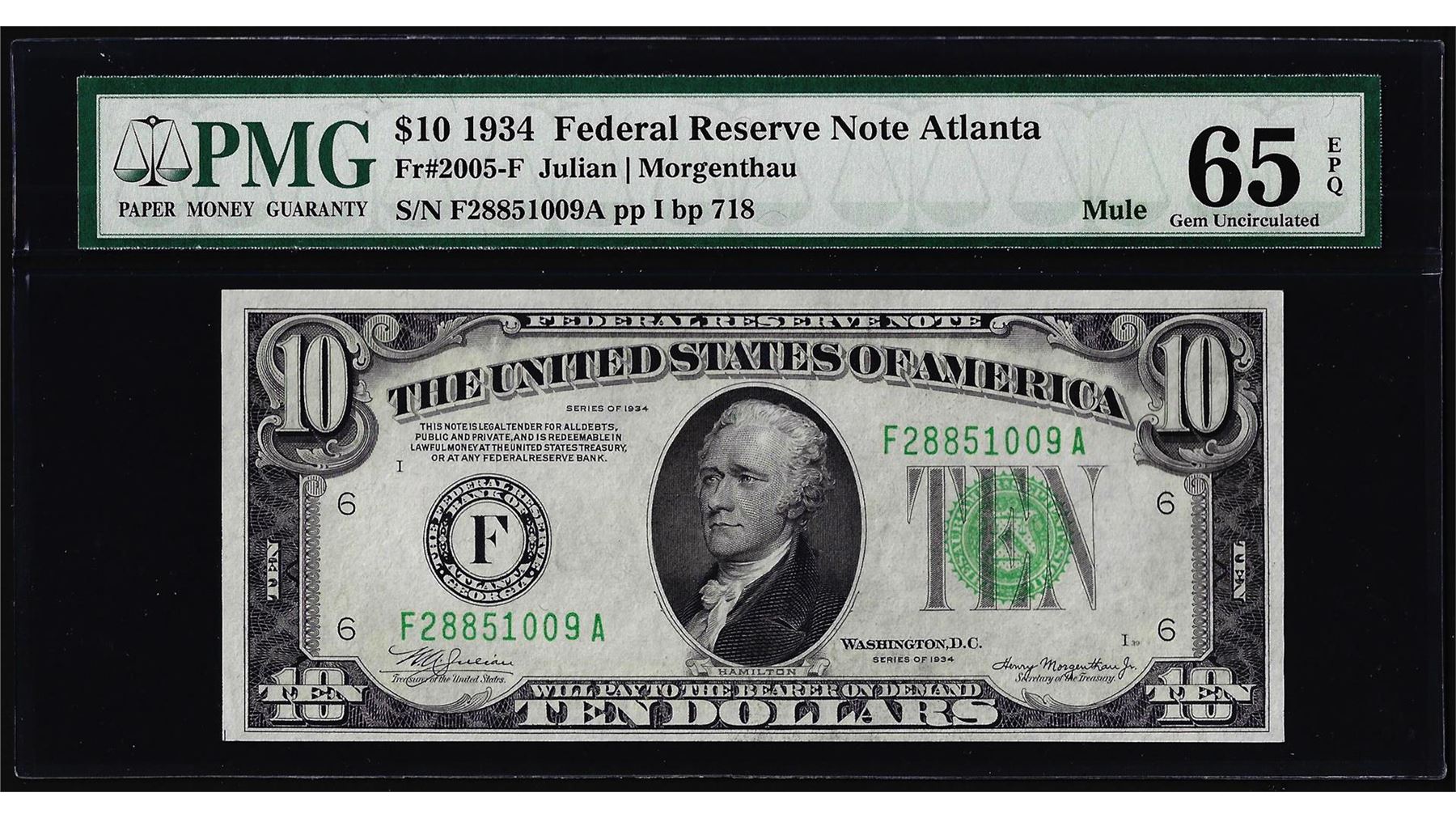 One 1934 $10 Federal Reserve Note Atlanta Fr.2005-F Mule PMG Gem Uncirculated 65EPQ. PMG Certified.