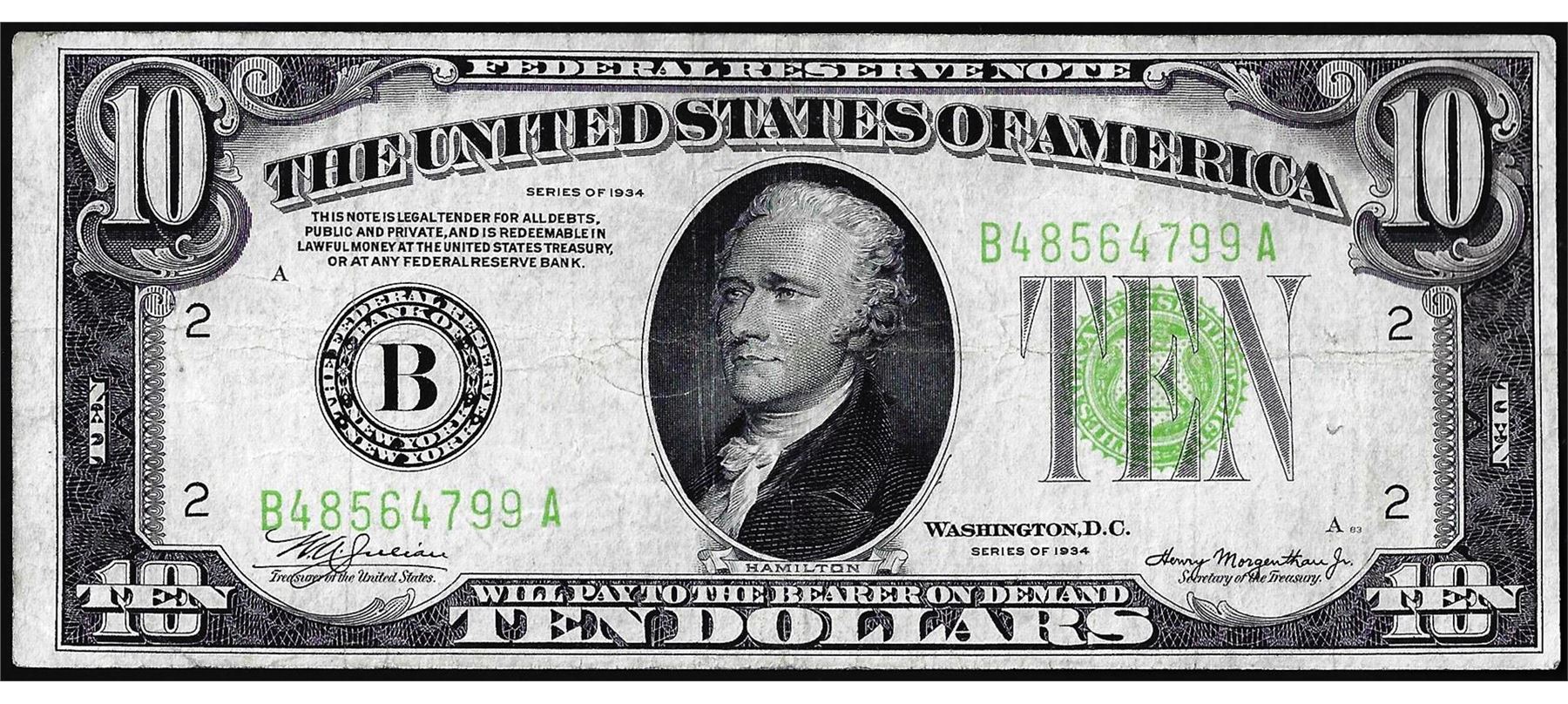 One 1934 $10 Federal Reserve Note New York Light Green Seal.