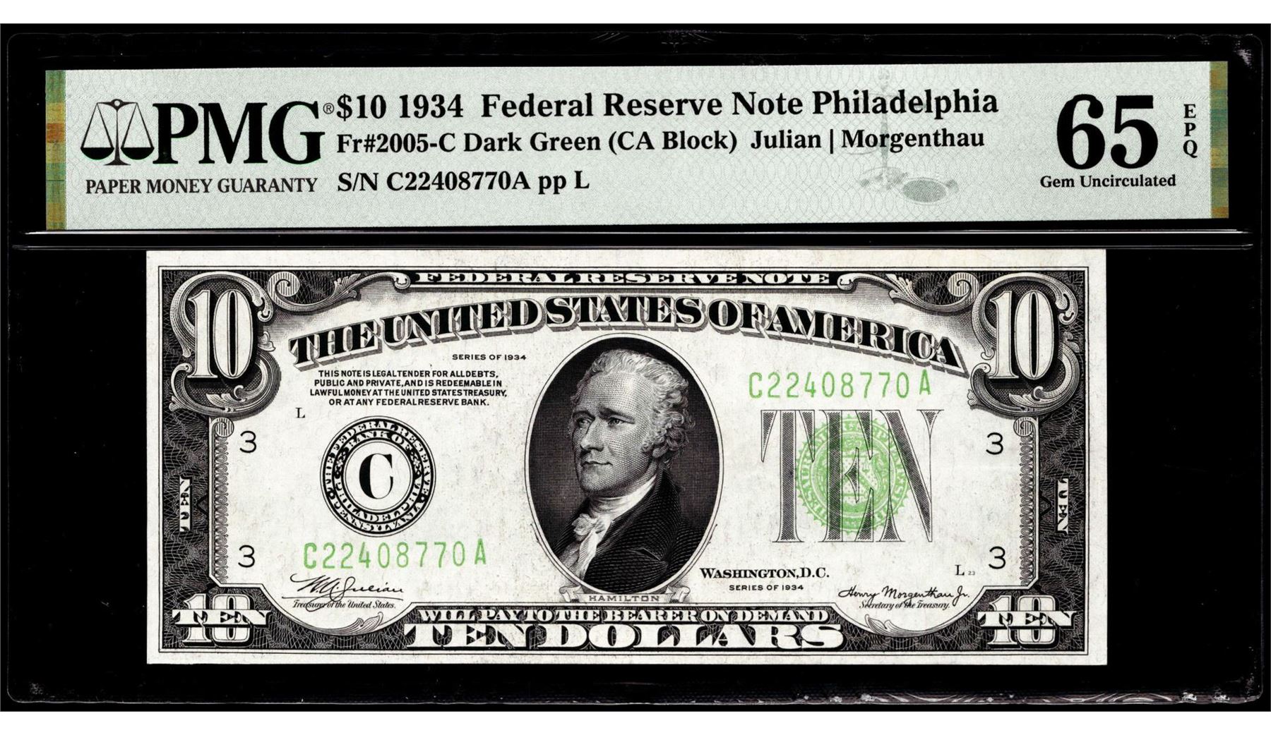1934 $10 Federal Reserve Note Philadelphia Fr.2005-C PMG Gem Uncirculated 65EPQ