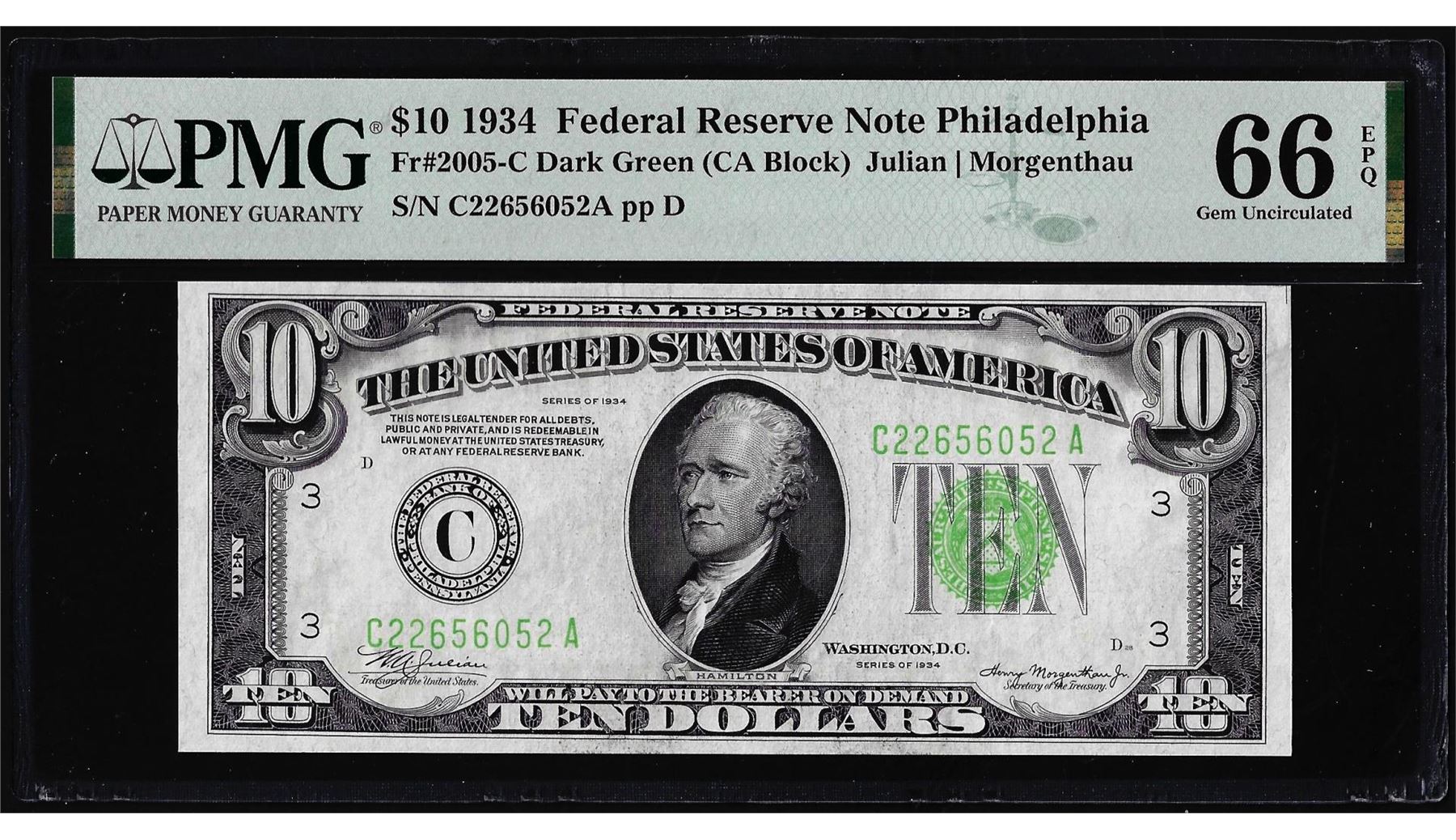 One 1934 $10 Federal Reserve Note Philadelphia Fr.2005-C PMG Gem Uncirculated 66EPQ. PMG Certified.