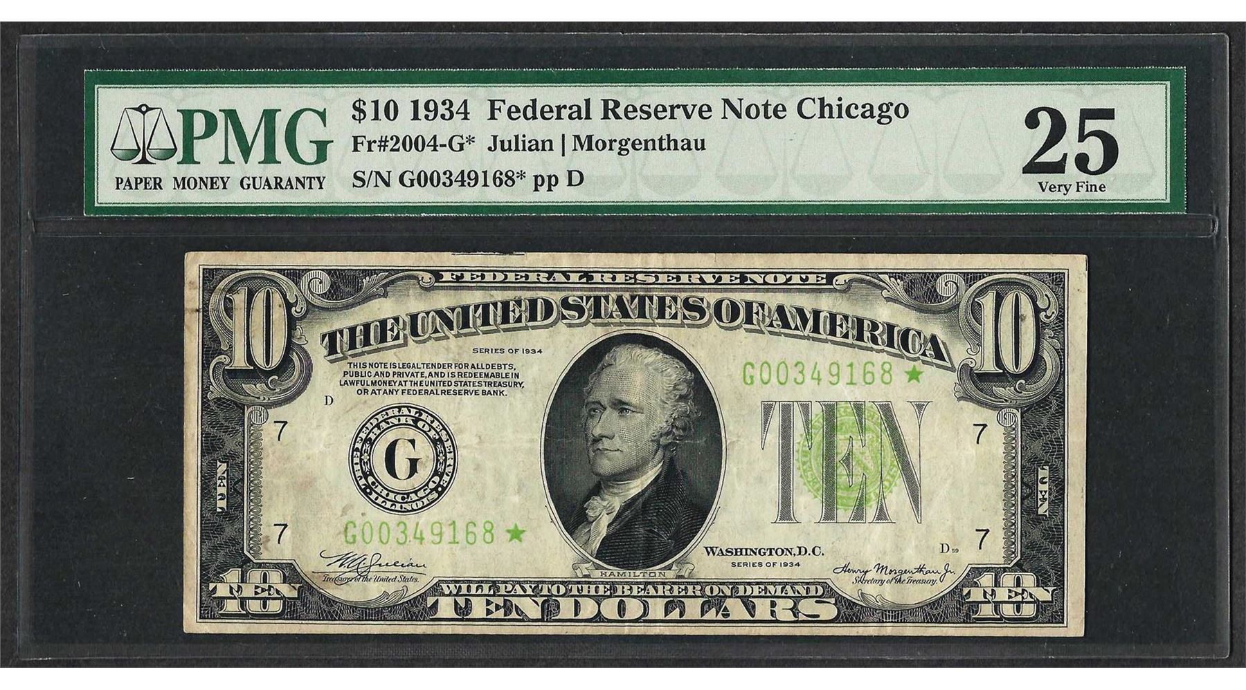 One 1934 $10 Federal Reserve STAR Note Chicago Fr.2004-G* PMG Very Fine 25. PMG Certified.