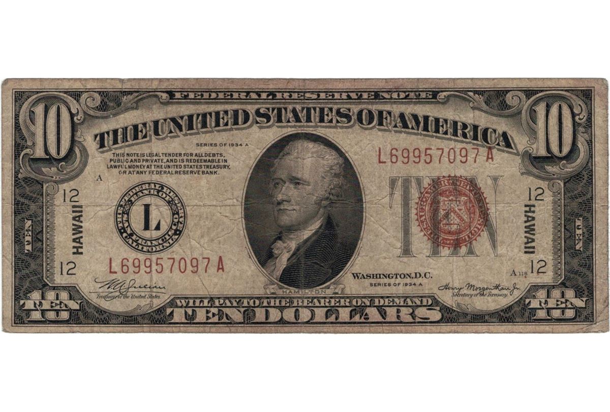 1934 $10 Hawaii Federal Reserve Note Currency.