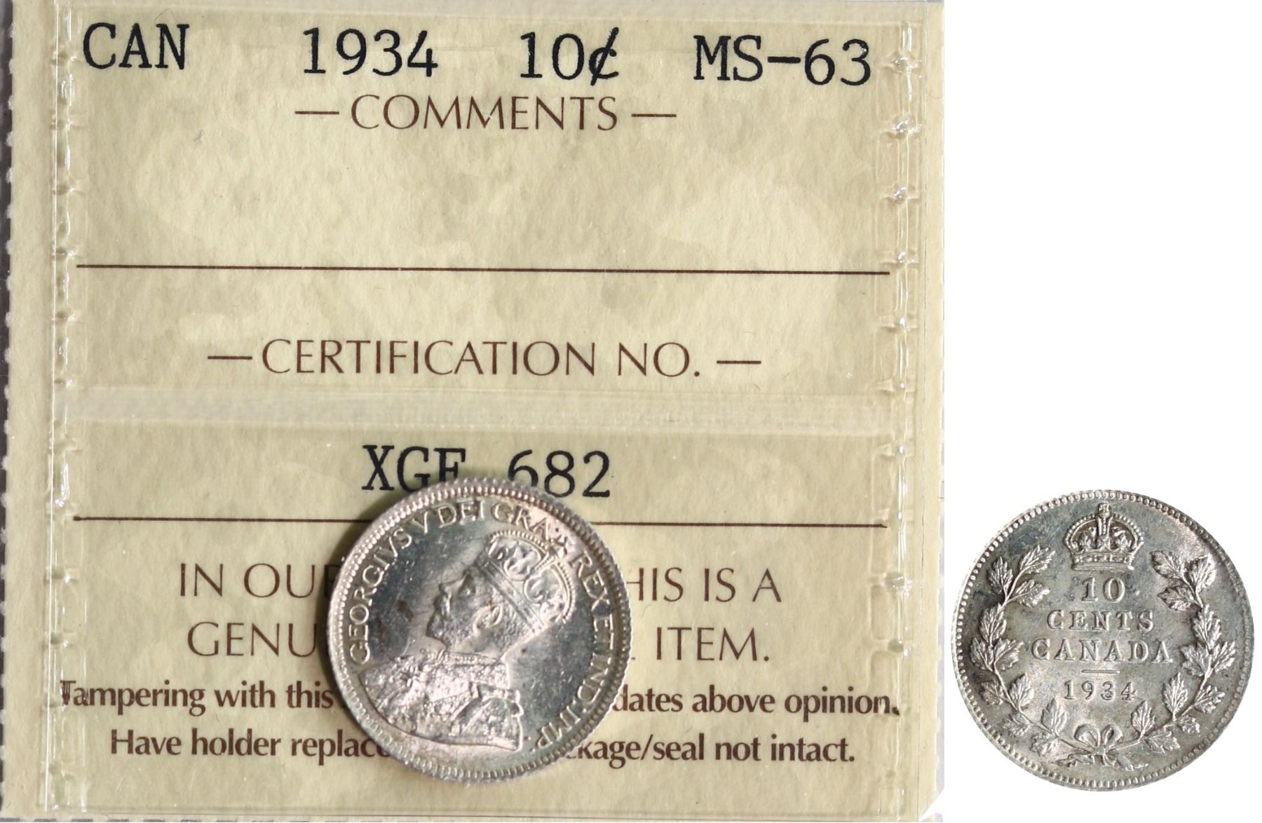 1934 10¢ ICCS Choice Mint State-63 Fully brilliant and lustrous. Scarce date.