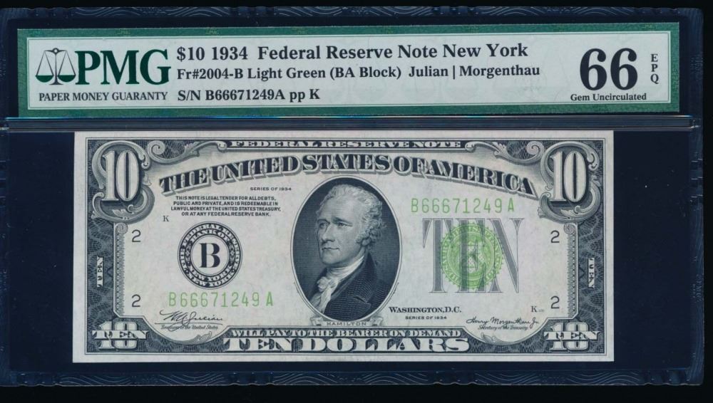 One 1934 $10 New York Federal Reserve Note PMG 66EPQ.