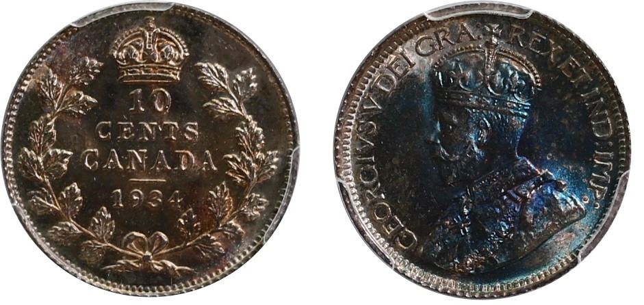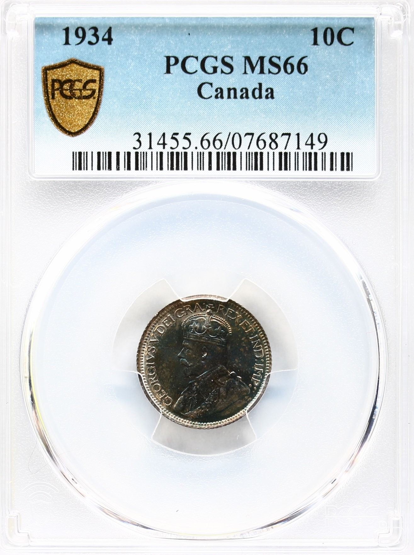 1934 10¢ PCGS Superb Gem Mint State-66, Lots of lustre with blue, green, russet and golden hues.
