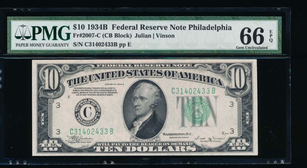 One 1934 $10 Philadelphia Federal Reserve Note PMG 66EPQ.