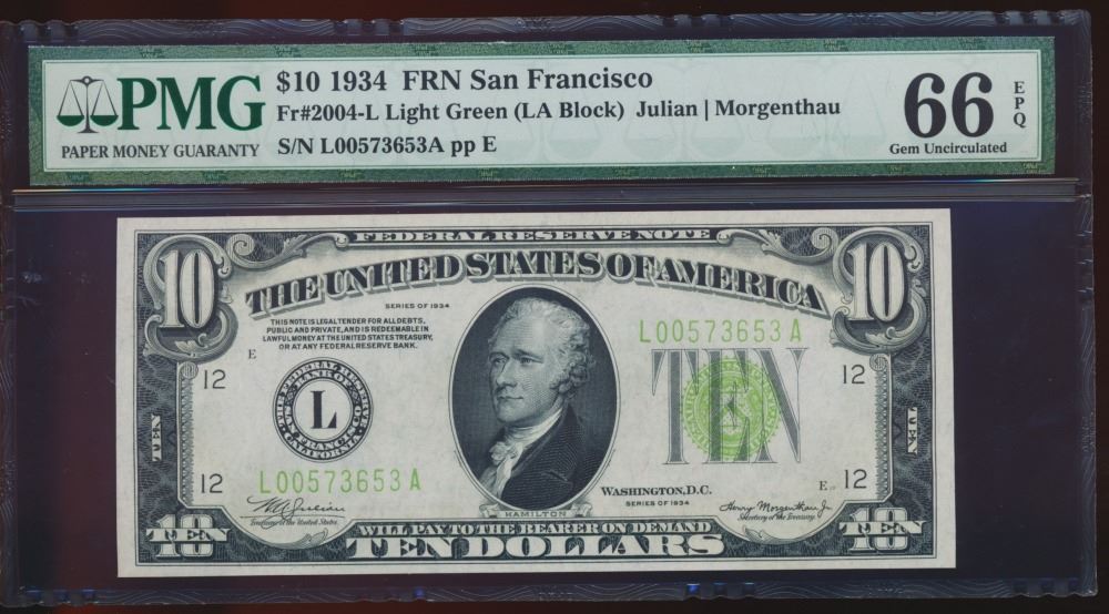 One 1934 $10 San Francisco Federal Reserve Note PMG 66EPQ.