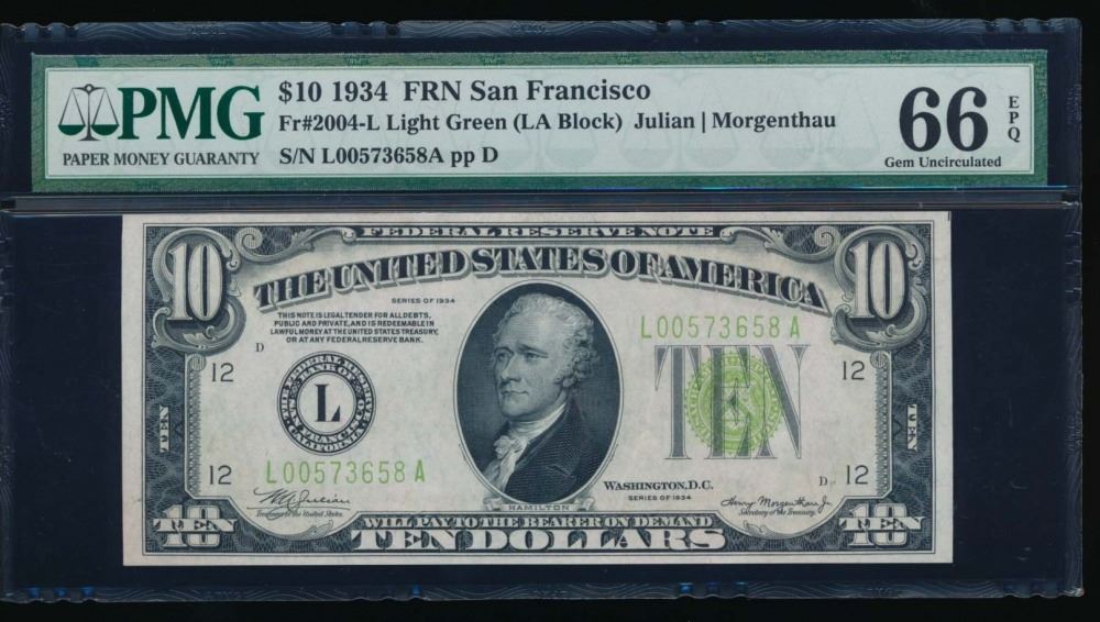 One 1934 $10 San Francisco Federal Reserve Note PMG 66EPQ.
