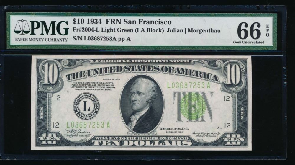 One 1934 $10 San Francisco Federal Reserve Note PMG 66EPQ.