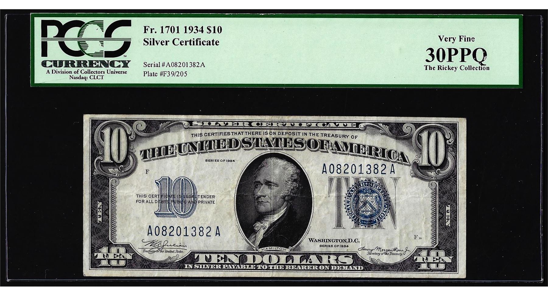 One 1934 $10 Silver Certificate Note Fr.1701 PCGS Very Fine 30PPQ. PCGS Graded.