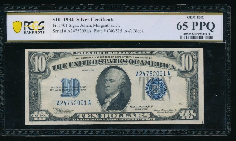 One 1934 $10 Silver Certificate PCGS 65PPQ.