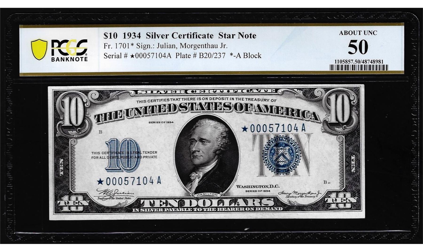 One 1934 $10 Silver Certificate STAR Note Fr.1701* PCGS About Uncirculated 50. PCGS Graded.
