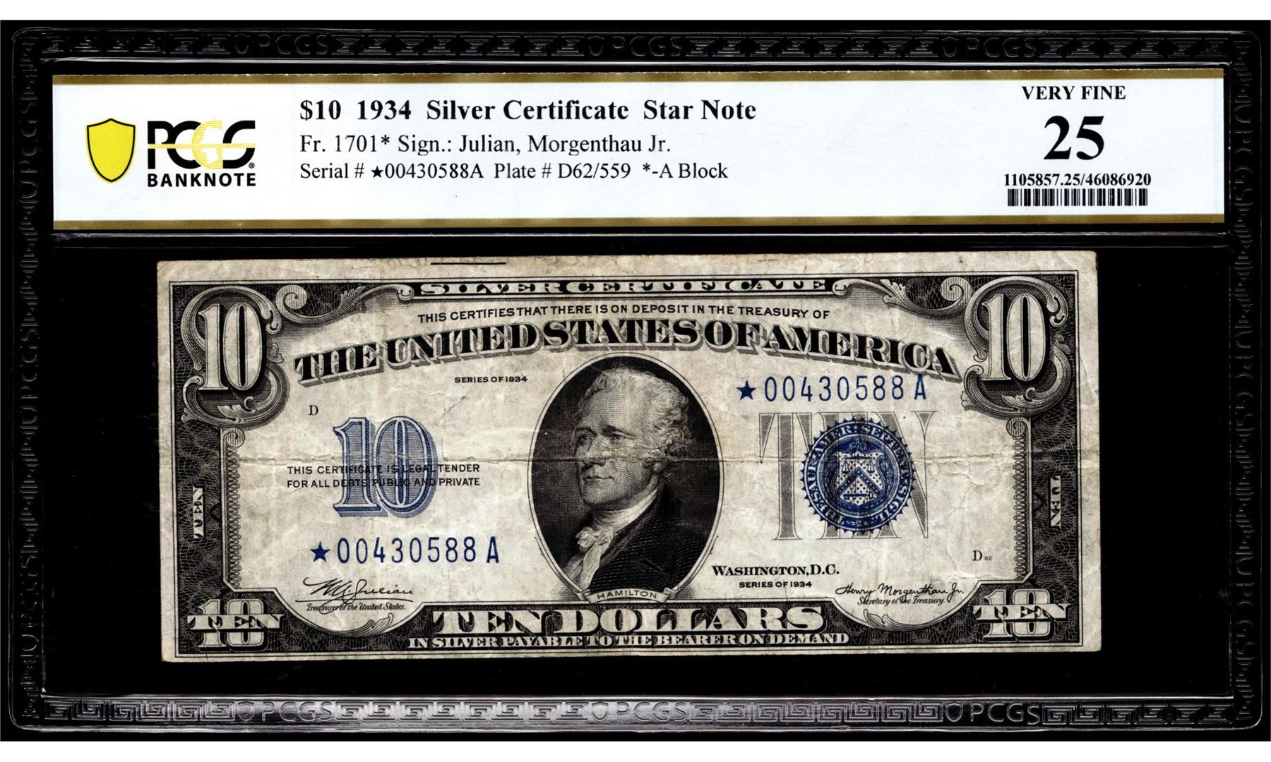 One 1934 $10 Silver Certificate STAR Note Fr.1701* PCGS Very Fine 25. PCGS Graded.