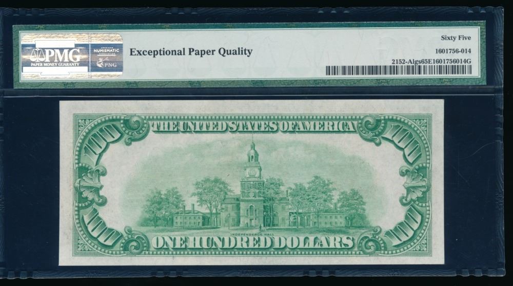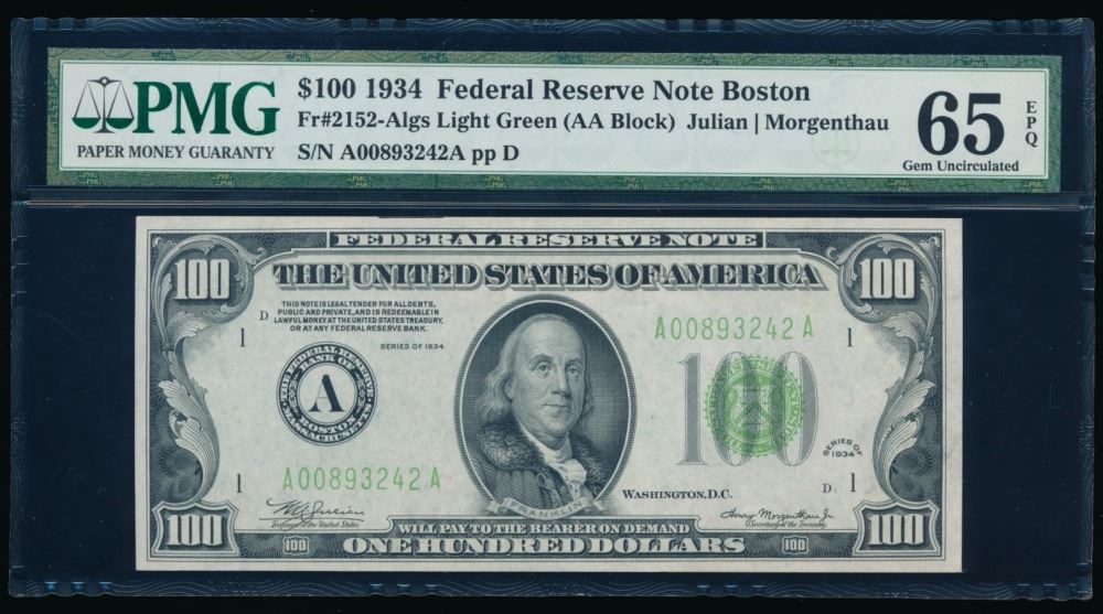 One 1934 $100 Boston FRN PMG 65EPQ.