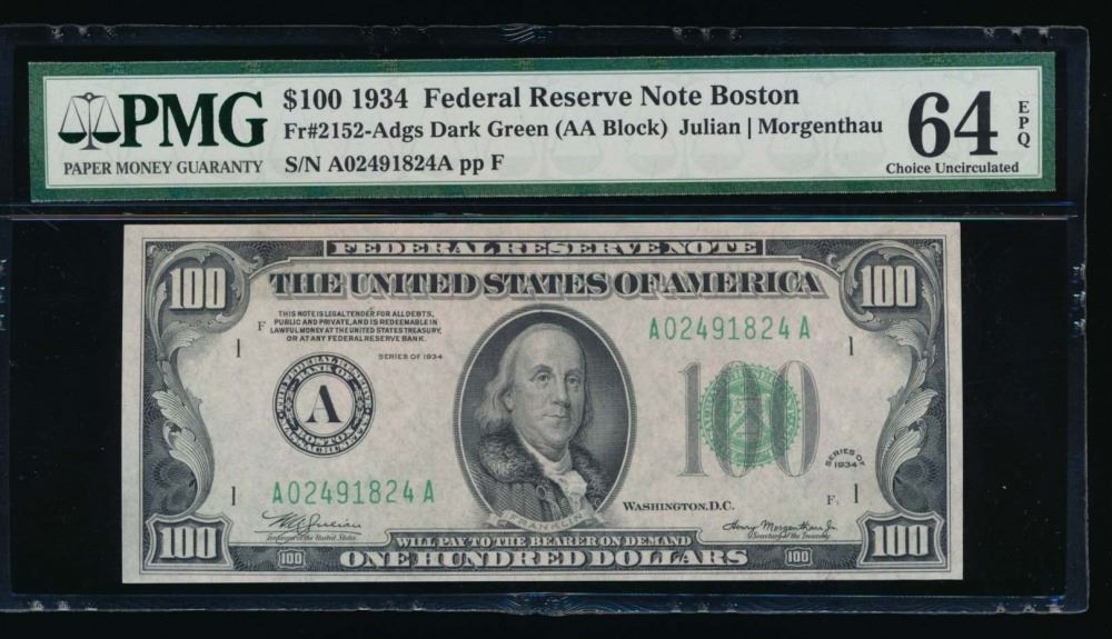 One 1934 $100 Boston Federal Reserve Note PMG 64EPQ.