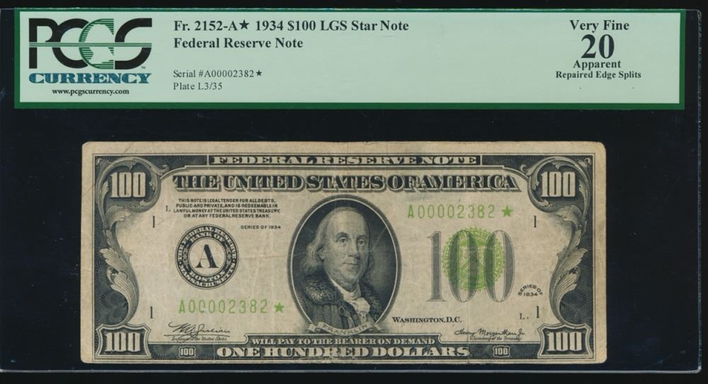 One 1934 $100 Boston Federal Reserve Star Note PCGS 20.