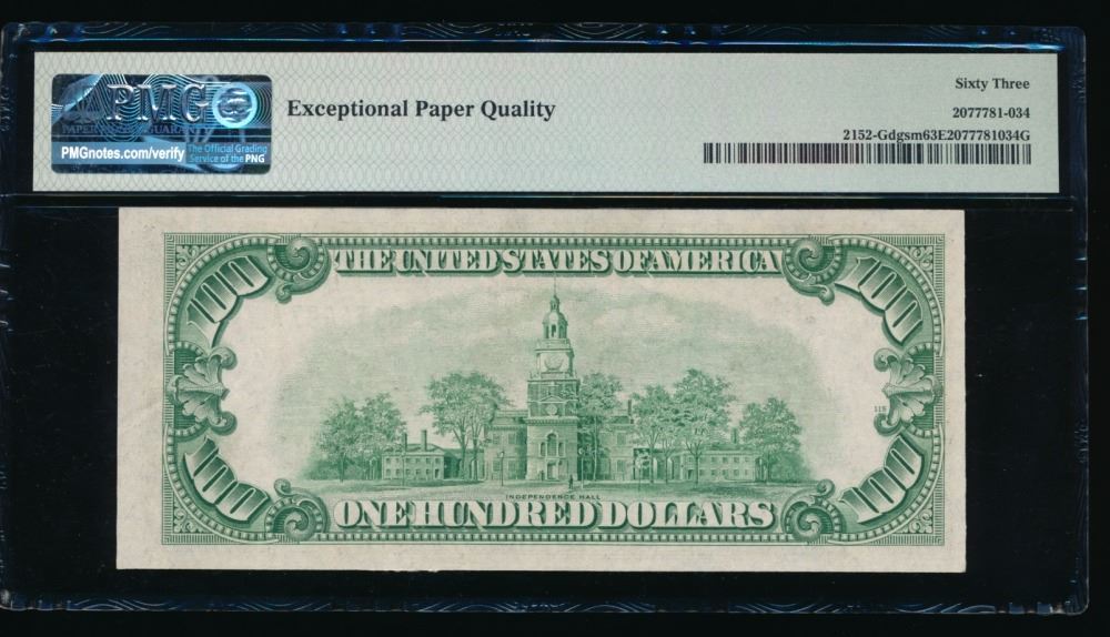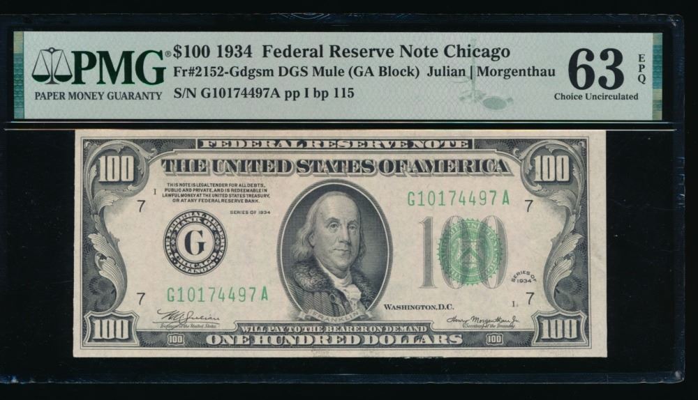 One 1934 $100 Chicago FRN PMG 63EPQ.