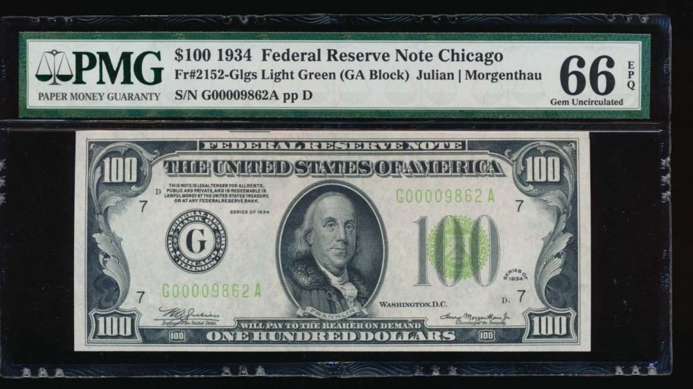 One 1934 $100 Chicago Federal Reserve Note PMG 66EPQ.