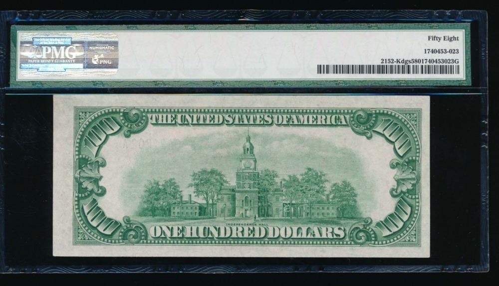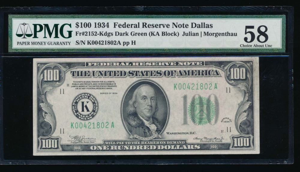 One 1934 $100 Dallas Federal Reserve Note PMG 58.