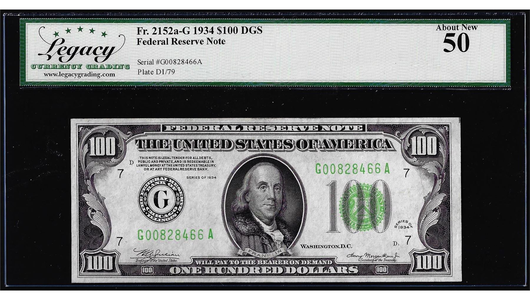 1934 $100 Federal Reserve Note Chicago Fr.2152-G Legacy About New 50