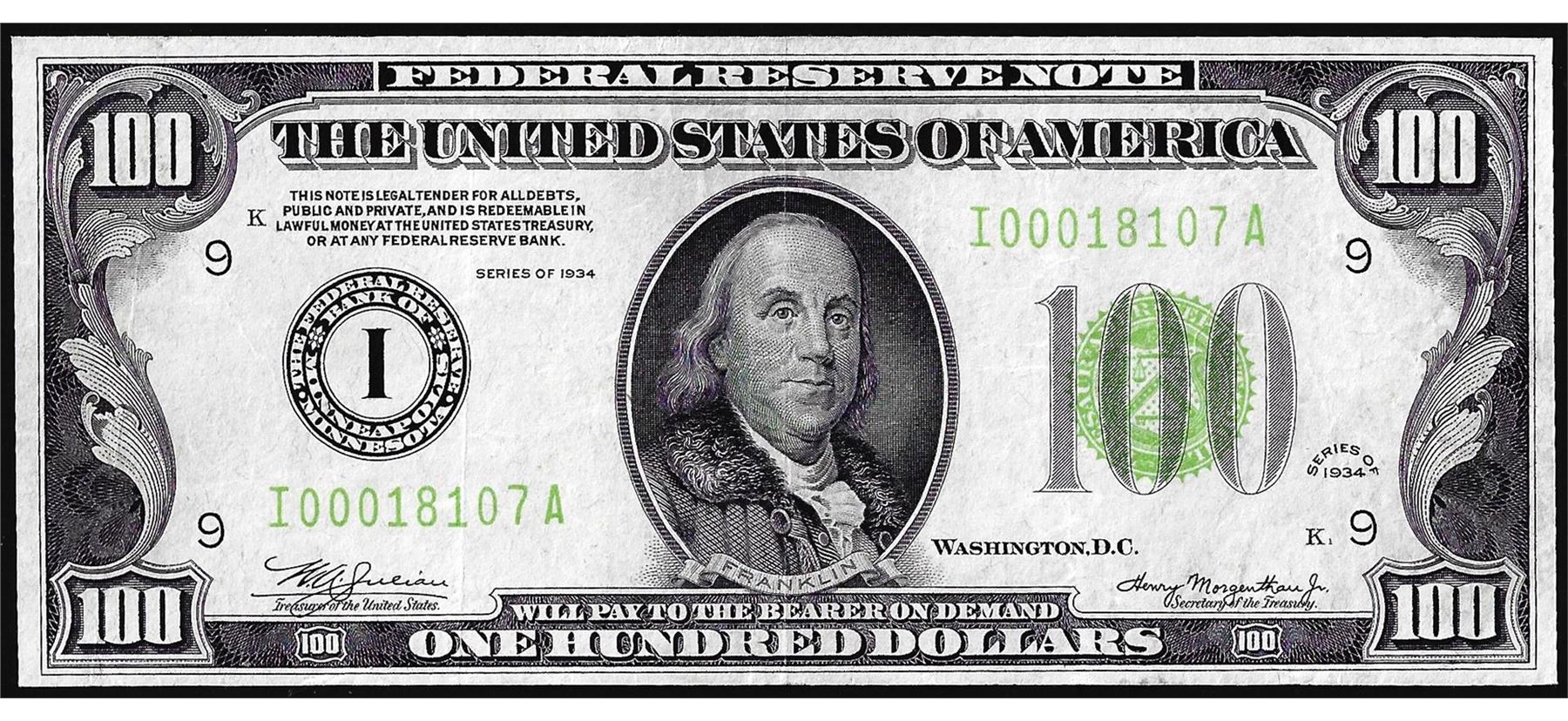One 1934 $100 Federal Reserve Note Minneapolis Light Green Seal.