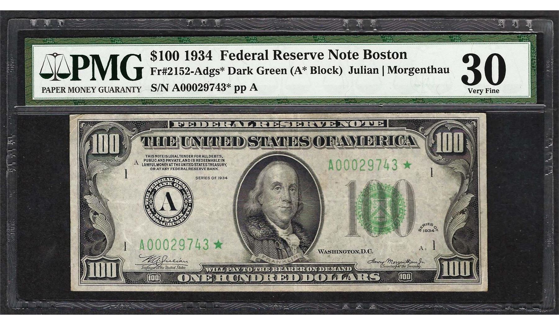 One 1934 $100 Federal Reserve STAR Note Fr.2152-A PMG Very Fine 30. PMG Certified.