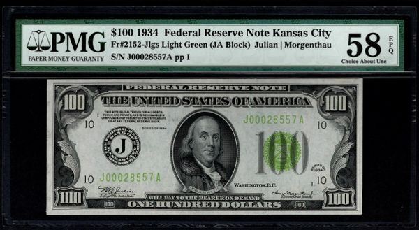 One 1934 $100 Kansas City Federal Reserve Note PMG 58EPQ.