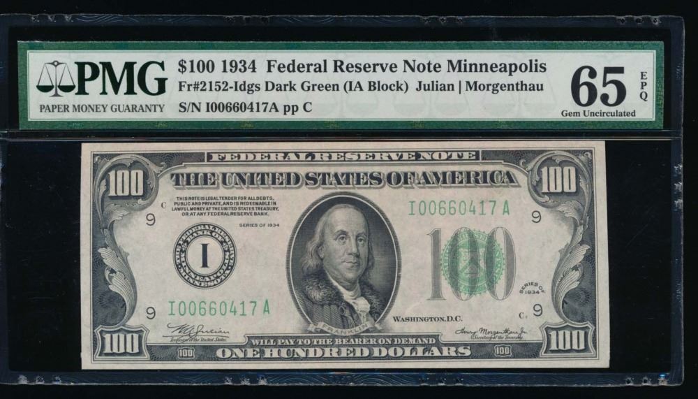One 1934 $100 Minneapolis Federal Reserve Note PMG 65EPQ.