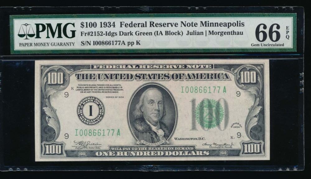 One 1934 $100 Minneapolis Federal Reserve Note PMG 66EPQ.