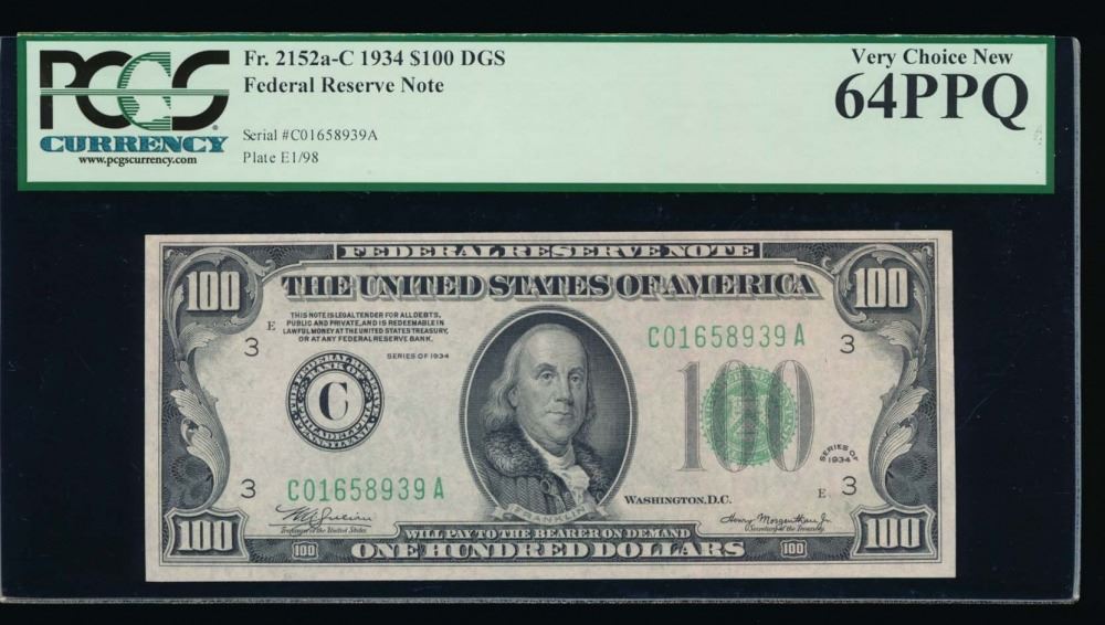 One 1934 $100 Philadelphia Federal Reserve Note PCGS 64PPQ.