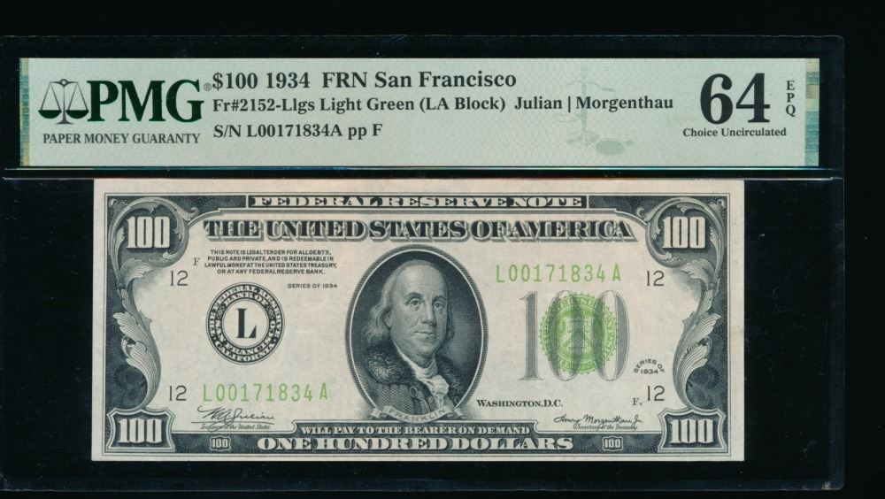 One 1934 $100 San Francisco FRN PMG 64EPQ .