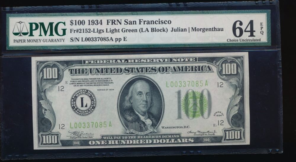 One 1934 $100 San Francisco Federal Reserve Note PMG 64EPQ.