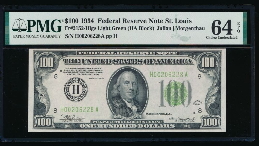 One 1934 $100 St Louis FRN PMG 64EPQ.