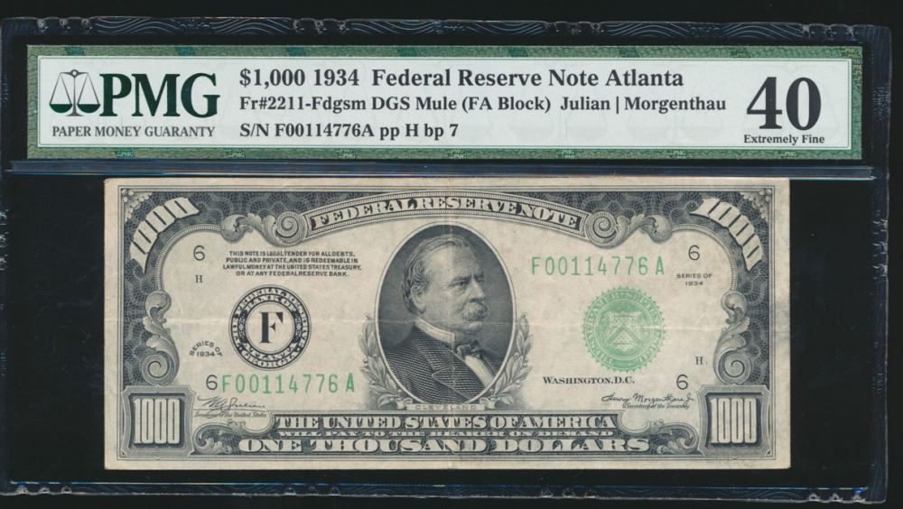 One 1934 $1000 Atlanta Federal Reserve Bank Note PMG 40.
