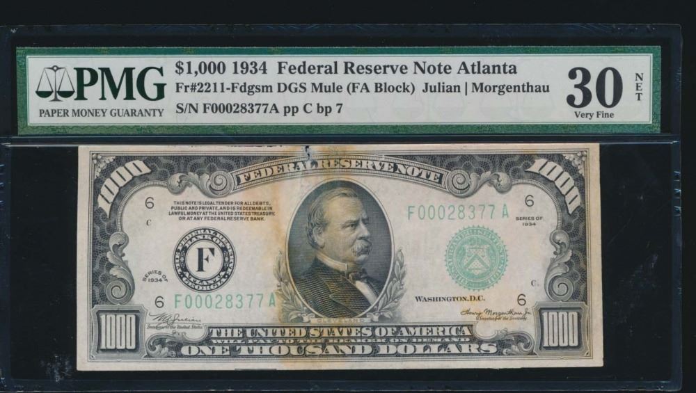 One 1934 $1000 Atlanta Federal Reserve Note PMG 30NET.