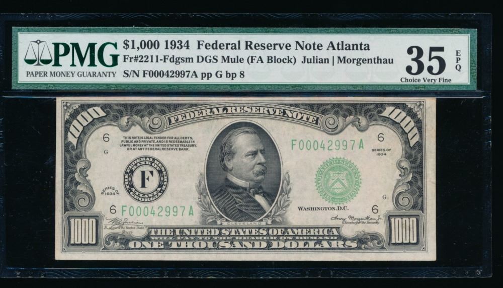 One 1934 $1000 Atlanta Federal Reserve Note PMG 35EPQ.
