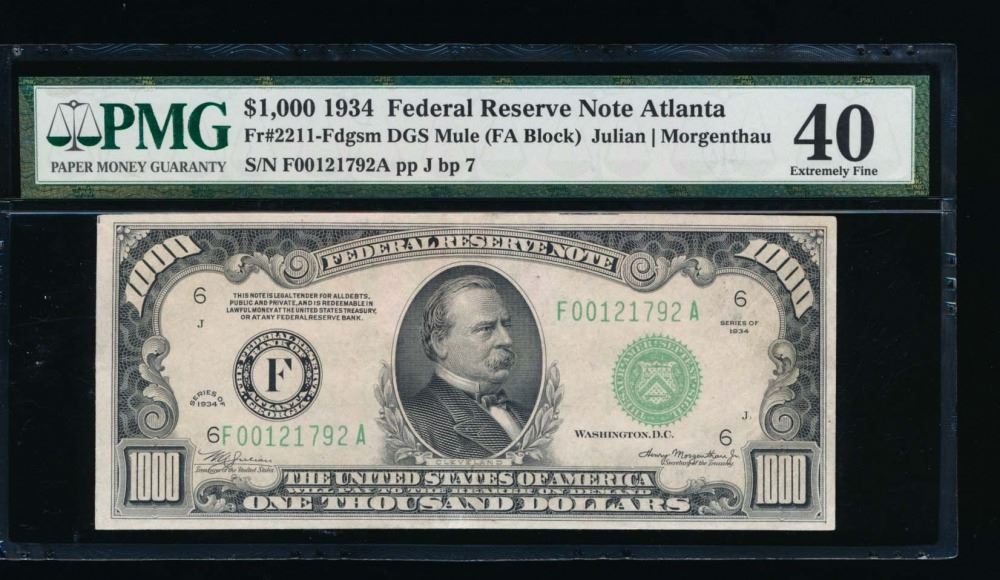 One 1934 $1000 Atlanta Federal Reserve Note PMG 40.