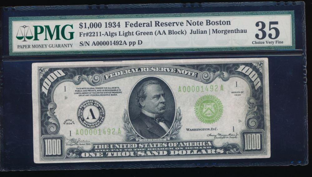One 1934 $1000 Boston Federal Reserve Bank Note PMG 35.