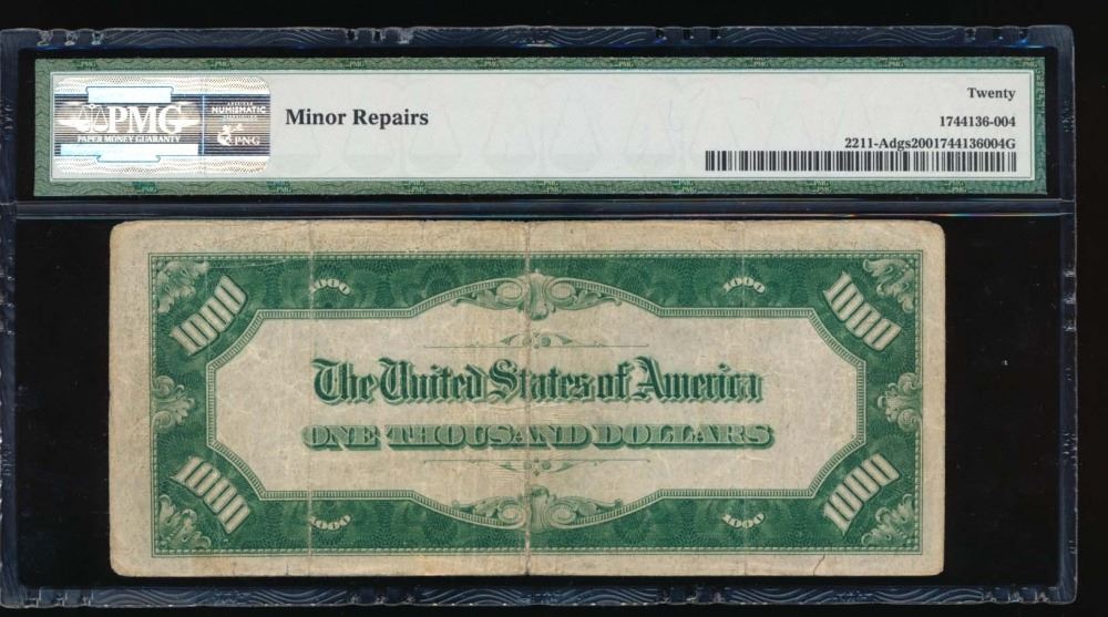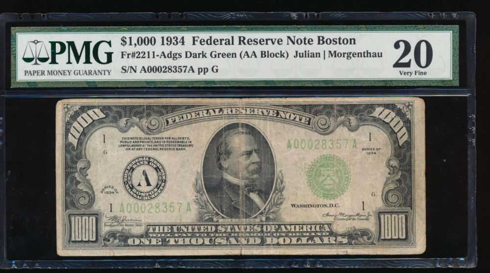 One 1934 $1000 Chicago Federal Reserve Note PMG 20. Minor repairs.