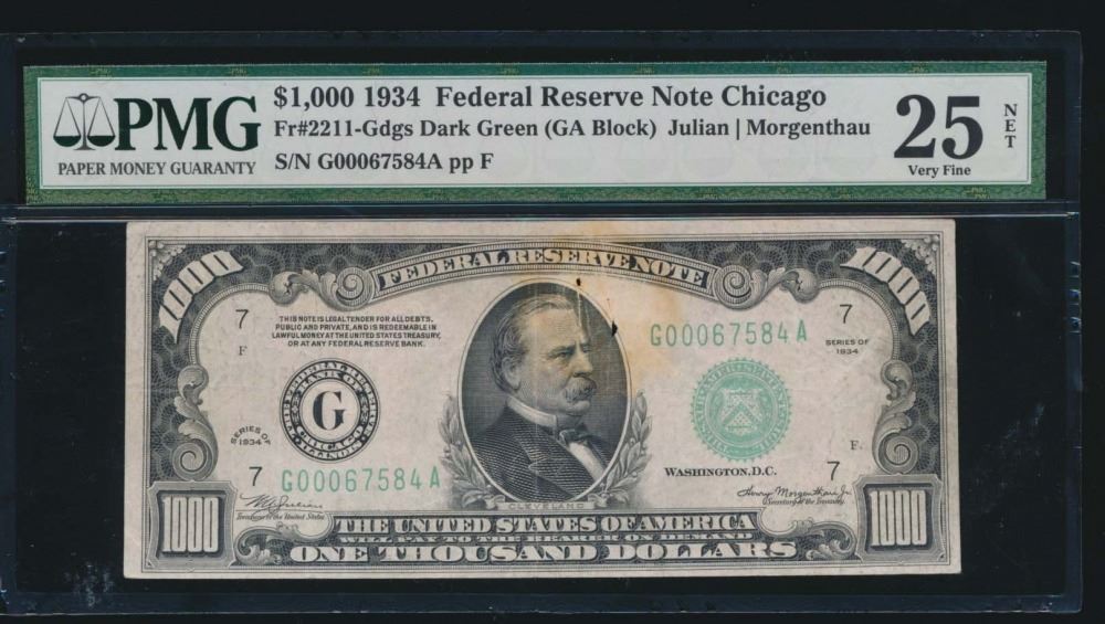 One 1934 $1000 Chicago Federal Reserve Note PMG 25NET.
