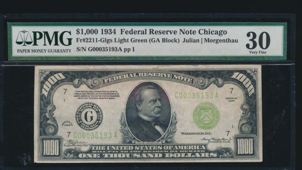 One 1934 $1000 Chicago Federal Reserve Note PMG 30.