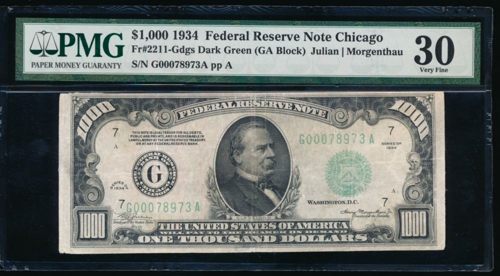 One 1934 $1000 Chicago Federal Reserve Note PMG 30.