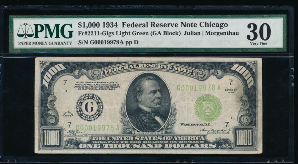 One 1934 $1000 Chicago Federal Reserve Note PMG 30.