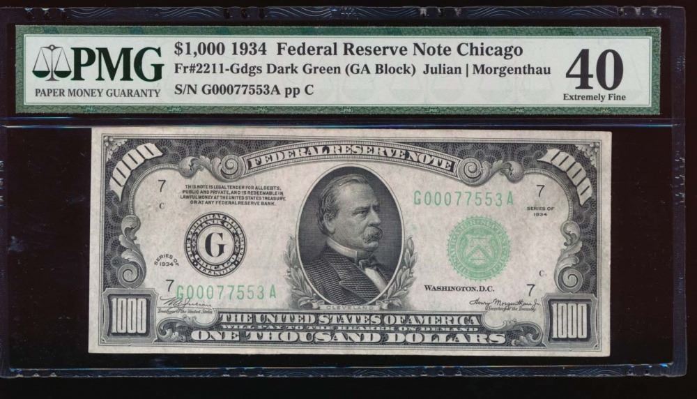 One 1934 $1000 Chicago Federal Reserve Note PMG 40.