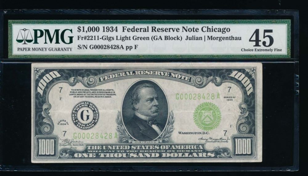 One 1934 $1000 Chicago Federal Reserve Note PMG 45.