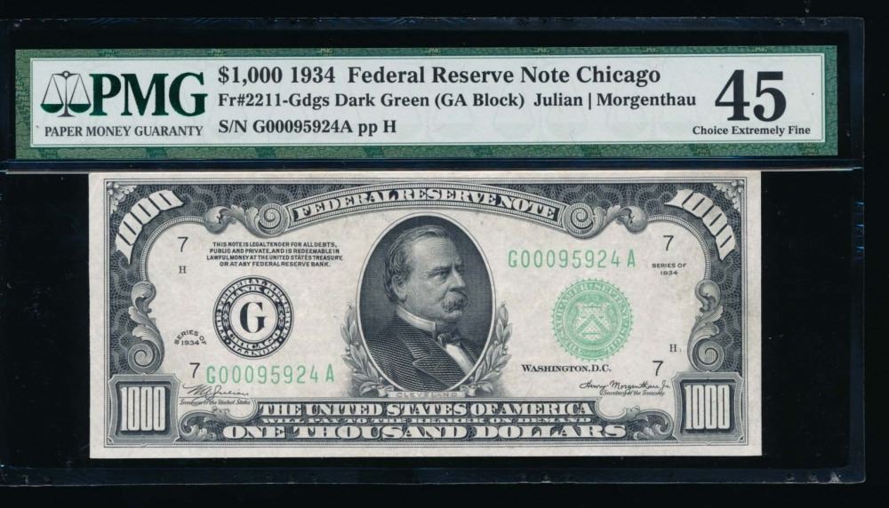 One 1934 $1000 Chicago Federal Reserve Note PMG 45.