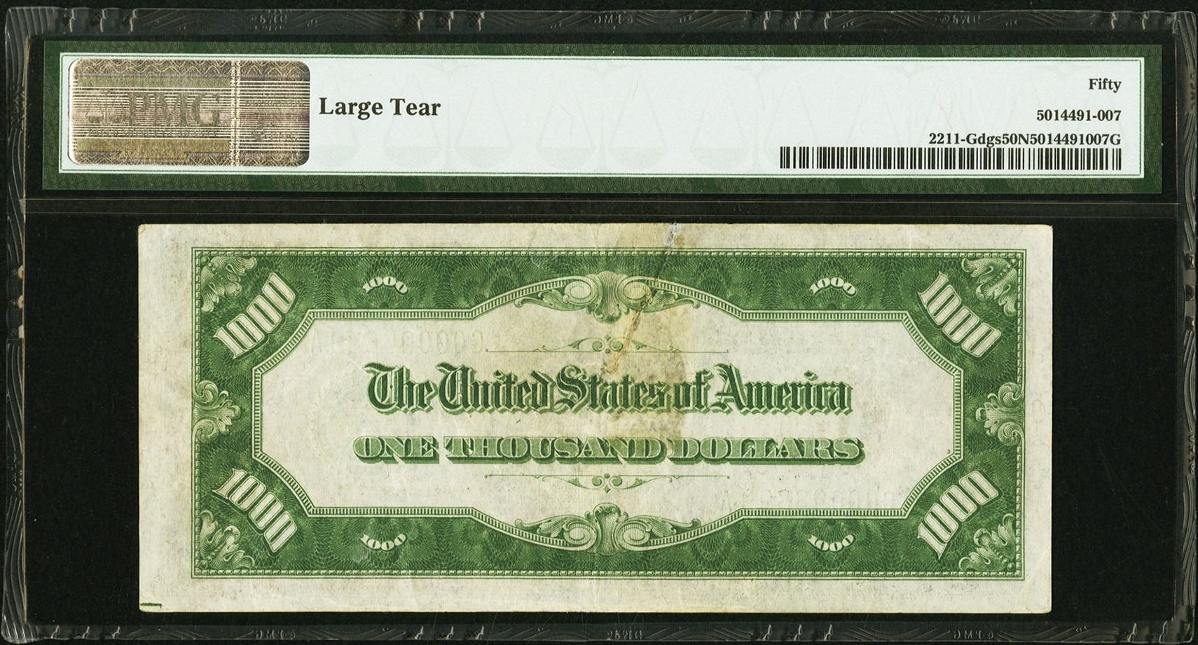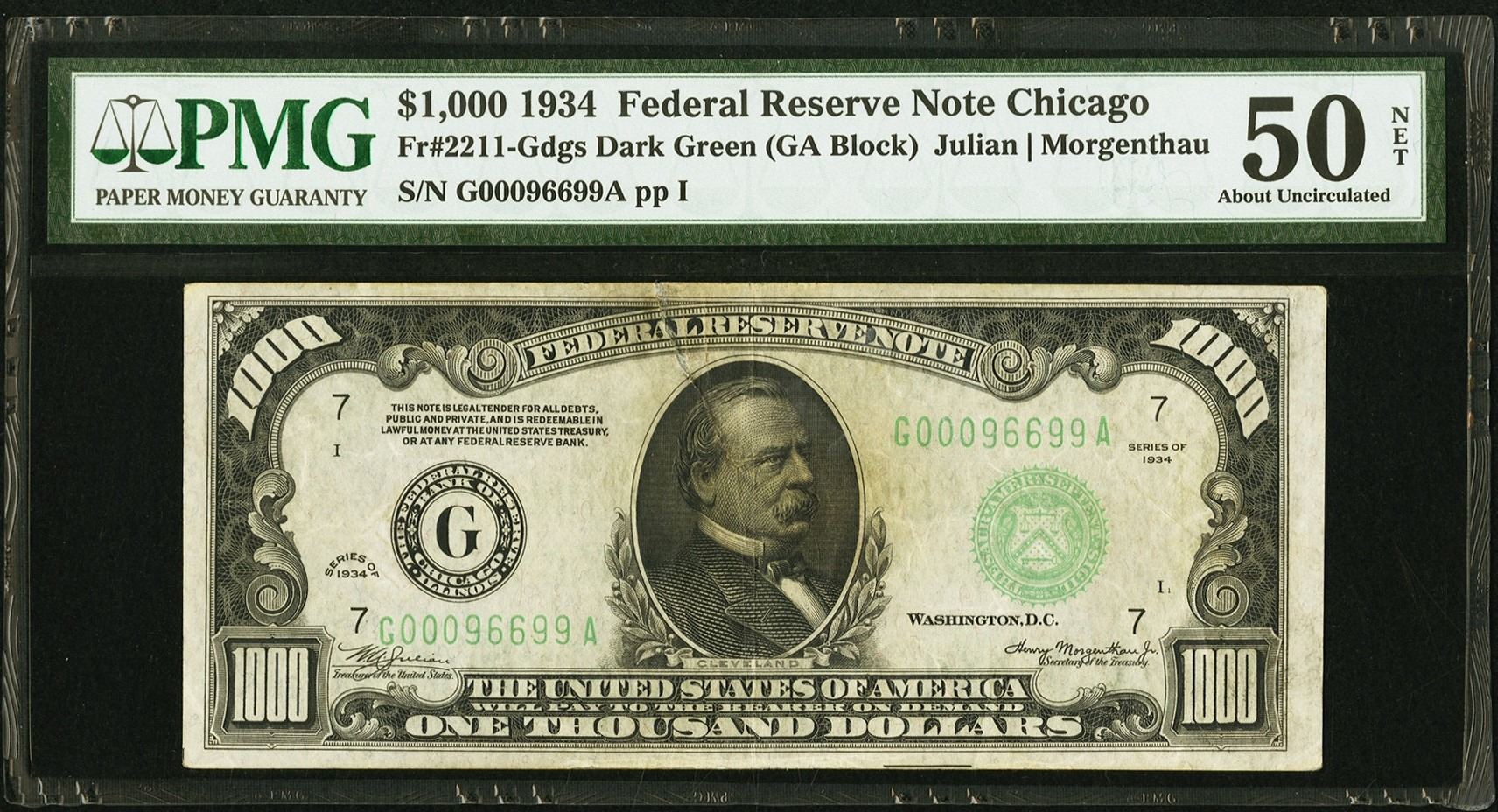 One 1934 $1000 Chicago Federal Reserve Note PMG 50NET.