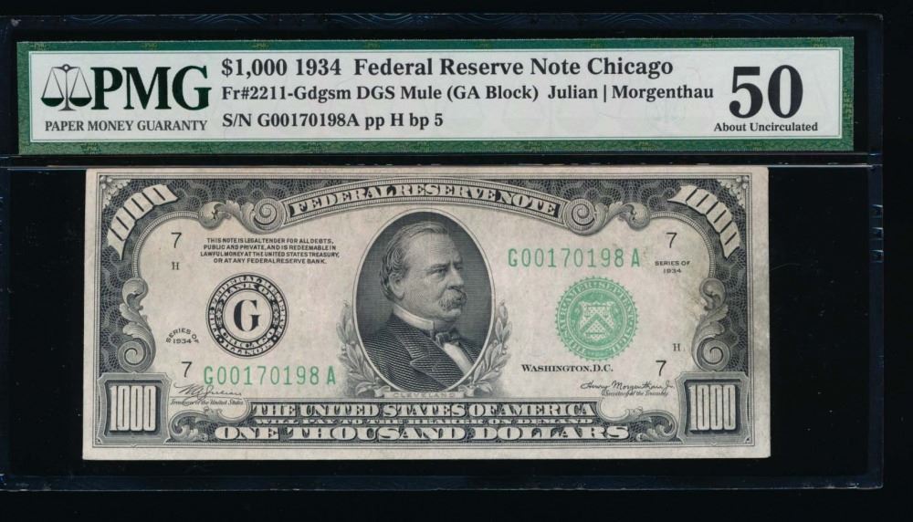One 1934 $1000 Chicago Federal Reserve Note PMG 50.
