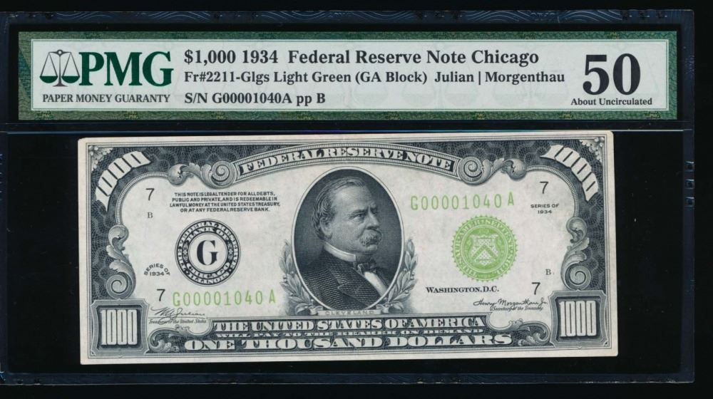 One 1934 $1000 Chicago Federal Reserve Note PMG 50.